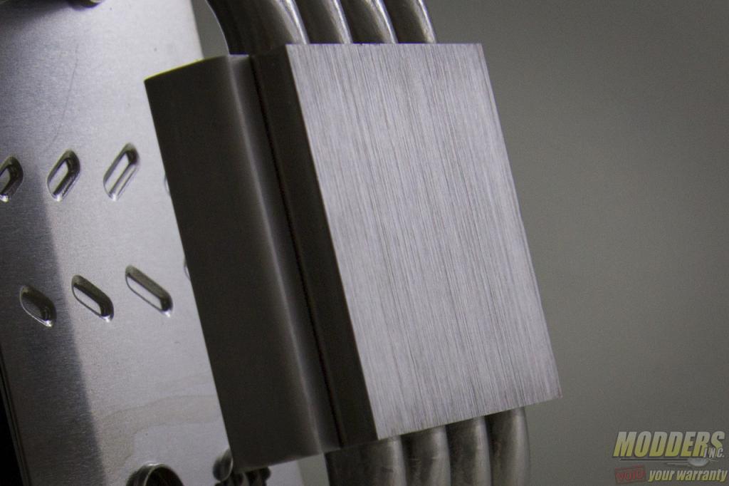 The contact surface measures 39 x 38mm, large enough even for an LGA2011/LGA2011-3 CPU IHS. The heatpipe contacts at the base are extremely clean with zero residue visible. These thick 8mm heatpipes and the rest of the surface are nickel coated copper. The contact texture is of a brushed metal look that is not smooth in any way.