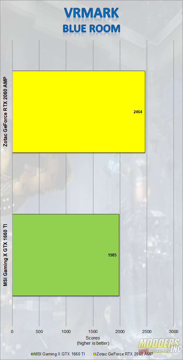 In all three tests, the MSI Gaming X 1660 ti fell just short of the 2060 AMP. But, this was to be expected as its a lower tier card. In the Orange Room benchmark, The MSI Gaming X 1660 ti achieved a score of 9614. The Cyan Room test was closer, but The MSI Gaming X 1660 ti s scored 6348 and in the Blue room, The MSI Gaming X 1660 ti scored 1985.