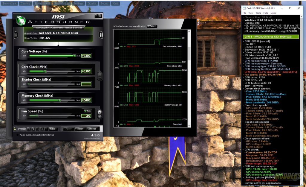The GTX 1060 Gaming X plus sample that I received came with a fairly high clock speed out of the box. Using MSI’s afterburner application I was able to push the card to a max boost speed of 2050 MHz on the GPU core and 10,012 MHz on the memory. I let a few automated bechmarks run for 2 hours in the background to ensure the stability of the overclock.