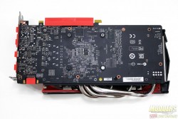 On the other side with the Twin Frozr V cooling system removed, the MSI GTX 960 Gaming 2G VRM design can now be seen. It is fairly straightforward, positioned between the GPU and the rear connectors instead of between the GPU and the power connectors (where this PCB has a lot of blank space instead). The memory modules used are Samsung K4G41325FC-HC28, specified to run at 1750MHz (7000MHz effective). Two are on the top side of the PCB and two are at the back. Only the two at the top side are actively cooled while the back modules are not. These memory chips are not in physical contact with the heatsink.