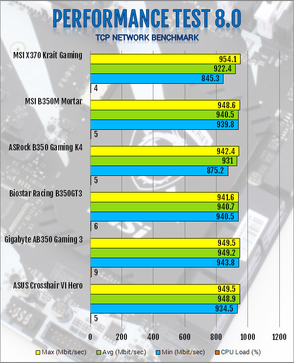 Network testing was conducted with a 4-port Cisco E3200 Gigabit Dual-Band Wireless N router and a pair of 6-ft long Cat5E cables connecting the server PC and the test motherboard. The server system is running an Intel Core i7-5775C processor on an Asrock Z97 Extreme 4 motherboard with an Intel i218V PHY. Interrupt Moderation was disabled, running TCP and UDP tests.