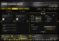 The last tab in Command Center is the OC Genie tab which is a desktop version of the same feature accessible on the UEFI or through the physical onboard button. Two “Gear” options are available: Gear 1 basically just set the Vcore to 1.2, disabled EIST, set the multiplier ratio to 40 (all cores) for a 4GHz clock. Gear 2 however, set the CPU to “per core” dynamic, ratio set to 44, set CPU Vcore to 1.225 and locked other voltages.