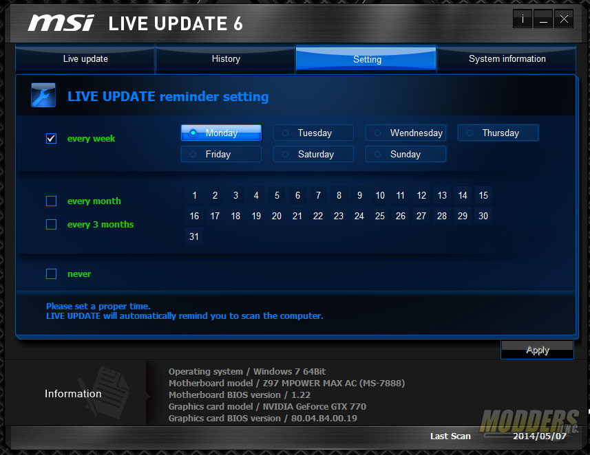 As the name suggests, this tool lets users keep their MSI Z97 MPower MAX up to date in terms of drivers, BIOS and software. Scheduled reminders can also be set periodically. Auto-install did not seem to work in this version of Live Update 6 as it just downloaded the updates but never launched the installer after.