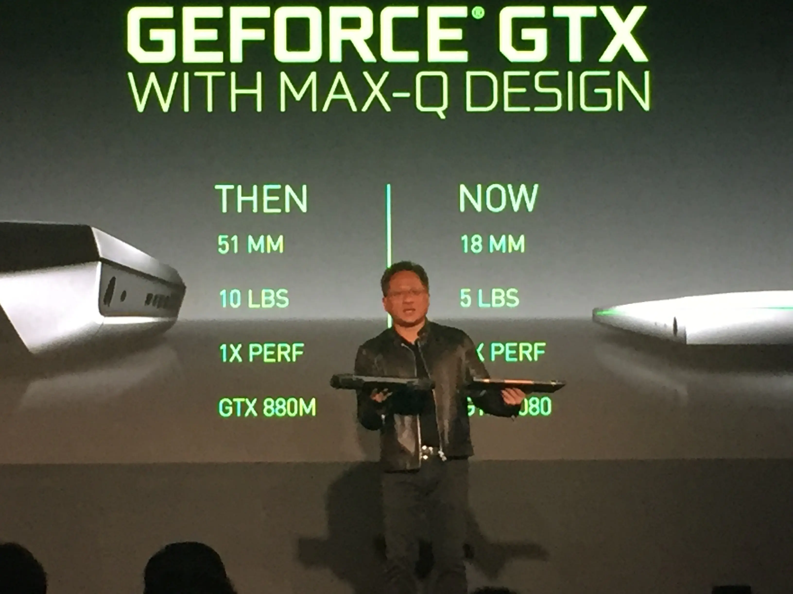 Most notably, the Max-Q design approach pushes for thinner gaming laptops, having a height of 18mm or less. Jen Hsun Huang held two notebooks on hand to demonstrate the dramatic design shift. On his right is a high-end NVIDIA powered gaming laptop from the previous generation that is 51mm thick. The new laptop also boasts half the weight at only 5lbs compared to 10lbs. All of this while providing 3x the performance of an NVIDIA GTX880M powered GPU. As Notebookcheck.net discovered last month, these new Max-Q notebooks also are equipped with a custom Pascal GPUs tuned to be more power efficient. While the MaxQ GTX 1080 performs just a little over a regular GTX1070 GPU in 3Dmark, it is expected to consume a lot less power and be tailored for mobile computing.