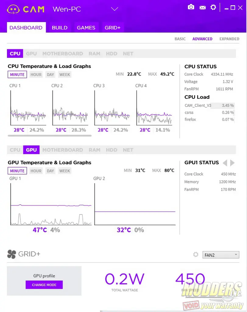 CAM Dashboard basic tabIn my case, I have the NZXT Grid+ V2 installed. As a result, the bottom portion of the dashboard is where a user can change the profile of each connected fan. This is done through a drop-down menu. Once the desired fan connector is selected, there is a wattage and RPM reading.
