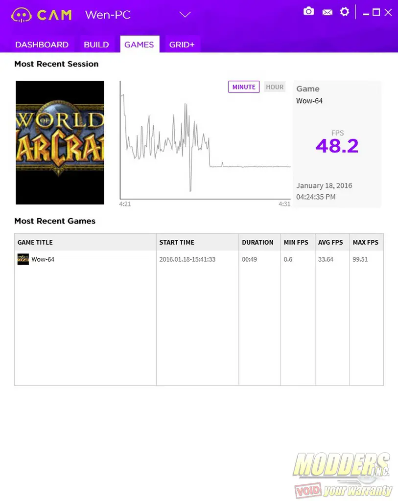 The game tab shows your most frequently played games and the history of frame-rate data. There is a frame-rate change over time for the latest gaming sessions. This is a great tool for benchmarking, and it is turned on by default. The problem with this is that this tool creates an overlay on each game unless the CAM overlay is disabled in the settings. The issue I found here is that when this overlay is disabled, this tab is unusable until the overlay is re-enabled.