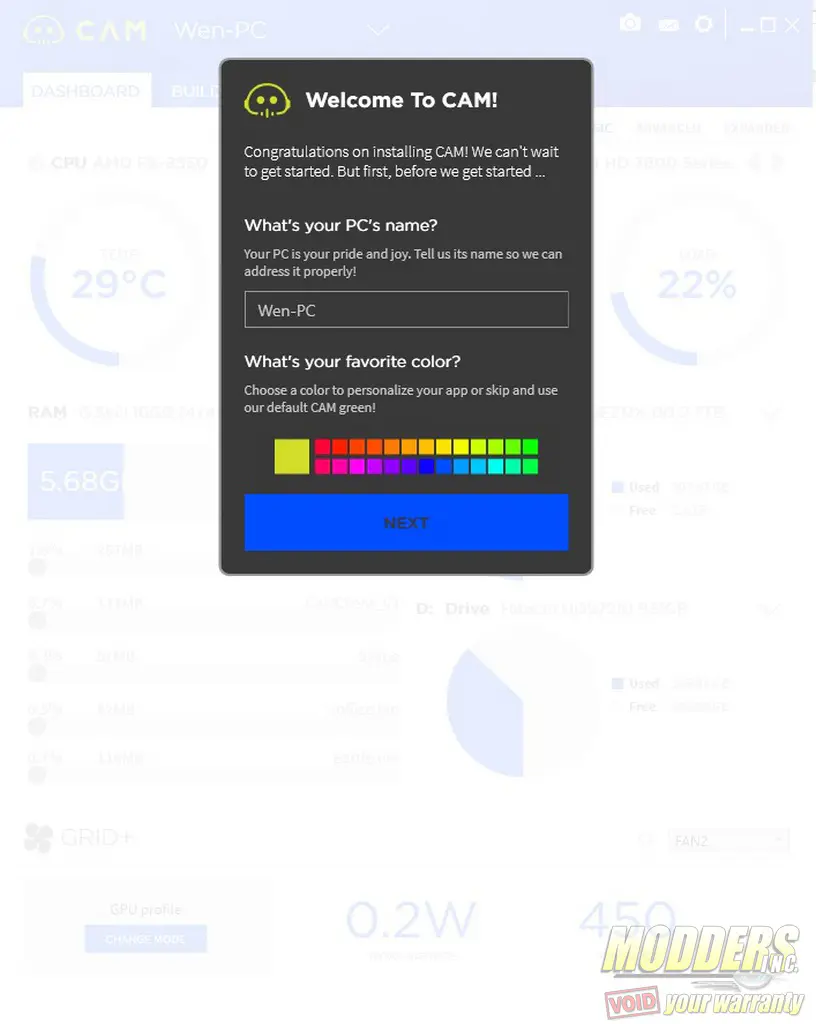 On the first run, there is a tutorial that will fade out the background. This tutorial prompts the user for a desired color scheme and introduces the user to the basic views in the CAM software. The default color is a light green theme but in this article, I have selected purple which you can see on all the screenshots. The dashboard tab has a basic, advanced, and expanded view to represent and monitor hardware. This is a welcome change since some novice users might be tempted to not install software they do not understand and consider it to be bloatware, but this kind of introduction could convince users to change their minds.