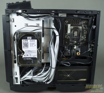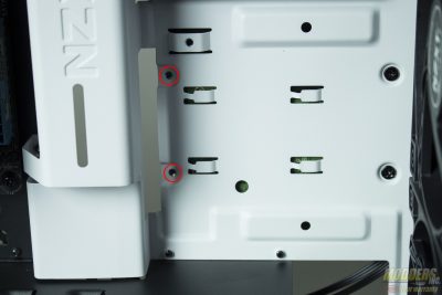 Around the two drive sleds, you can see six mounting holes, these are one 3.5″ drive that is mounted at the rear of the panel and can be mounted at a low or high position depending on your preference. Note the the two mounting holes circled in red, those will be normally blocked off by the lower 2.5″ drive sled.