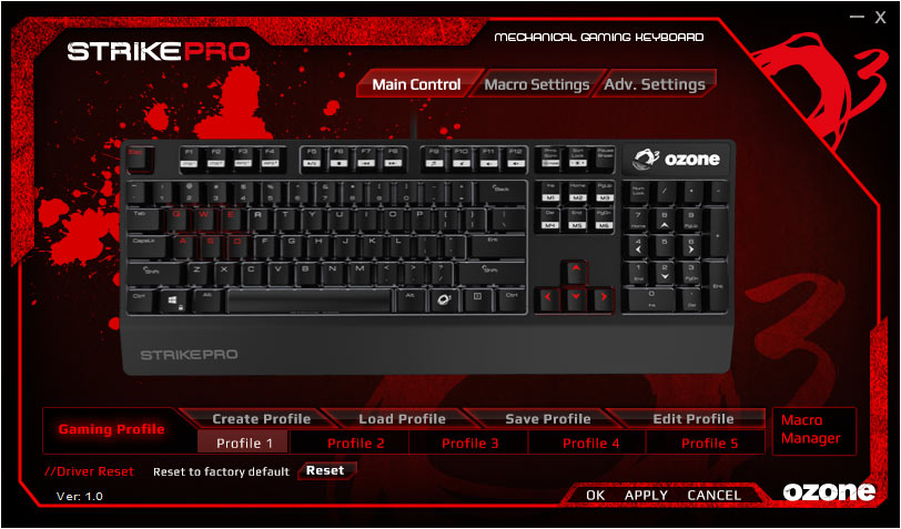 Installing the Strike Pro Software is not necessary for using the Ozone Strike Pro keyboard but it does open up more options for the user such as macro recording, profile management and individual key remap controls. The layout of the software is such that the bottom area containing the profile selection, adjustment and macro manager launcher remain fixed across all three tabbed settings. At any time, the user can reset the values to factory default or switch from one of the five profile banks. Users can also create extra profiles outside of the profile banks and save it to a local drive (including USB drives) as a GPK file so it can be recalled at a later time. The first tab on the screen is the Main Control tab which allows users to re-assign values on most of the keys with the exception of keys that have a secondary function, as well as the Windows and Ozone function key.