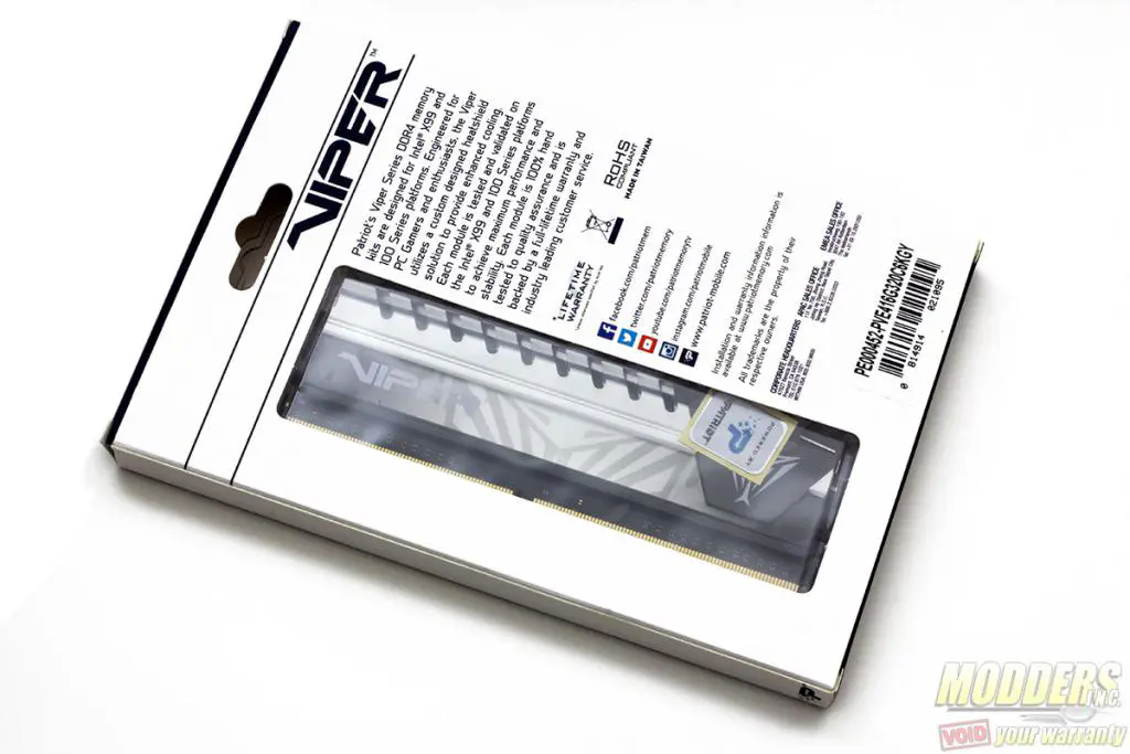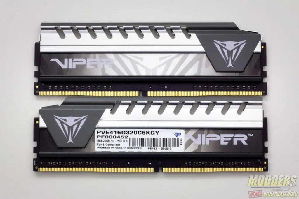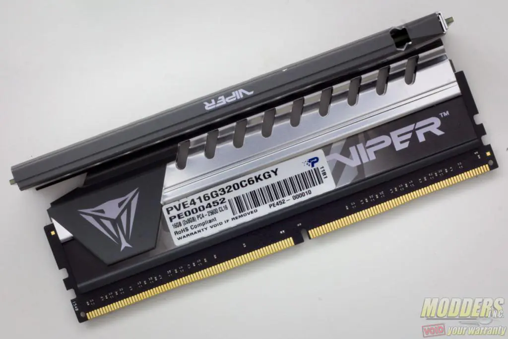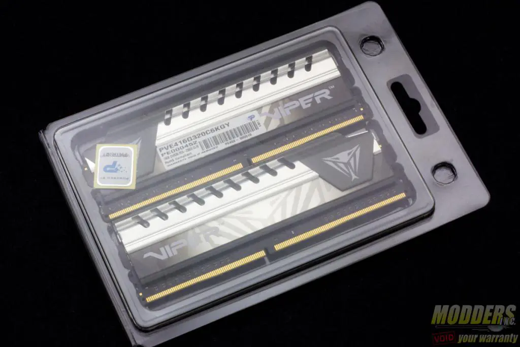 The Patriot Viper Elite DDR4 kit package comes in a two-piece design consisting of an outer box and a see-through blister packaging inside. Users get a full preview of one of the modules on the front and back through the box cut-out. Inside the protective plastic packaging with the modules is a “Powered by Patriot” sticker. This sample in particular is a dual-channel 3200MHz CL16 kit that comes in a pair of 8GB modules (16GB kit) with a gray spine.
