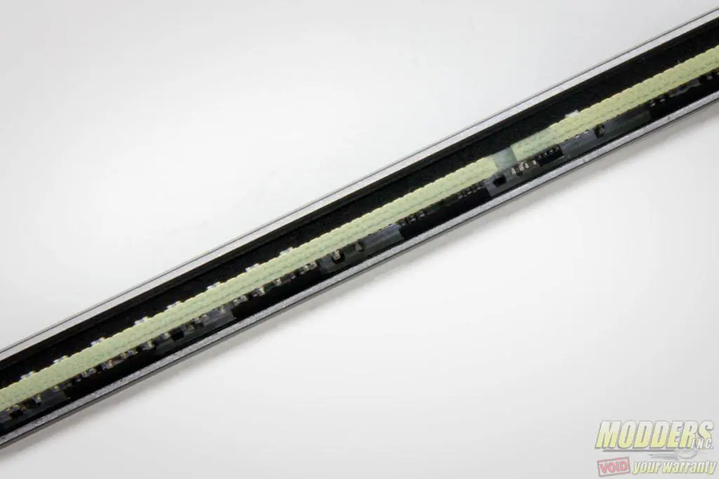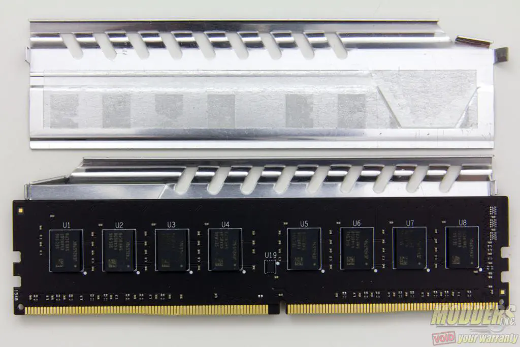 Looking from the bottom reveals that the 8GB module is single-sided and removal of the heatspreader reveals the IC to be Samsung K4A8G085WB. The aluminum heatspreader is very easy to remove and the adhesive did not need to be heat treated for easier removal. There are no screws holding the heat spreaders or the spine in place like it is on the Patriot Viper 4 modules which has a more substantial heatsink.