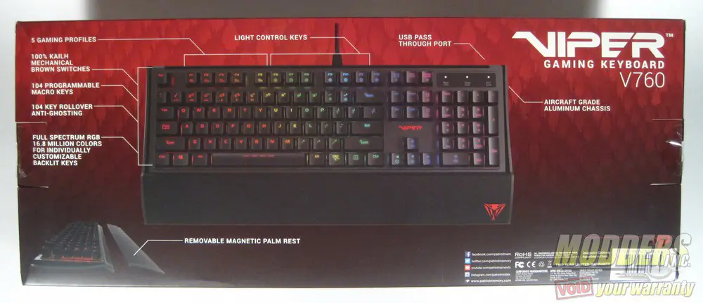 The packaging is a sturdy, red box inside a thin windowed box, with both ends sealed with tape circles. The front, back, and sides outline the numerous features of the of the Viper V760.