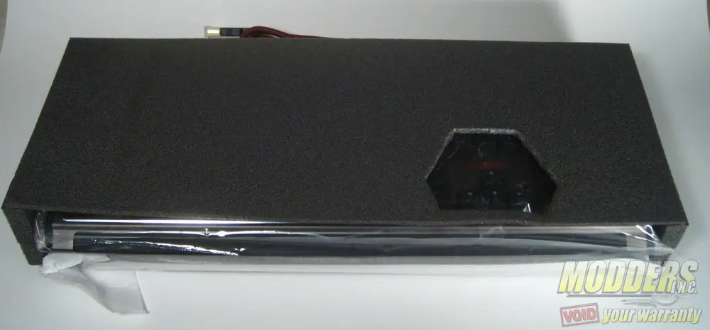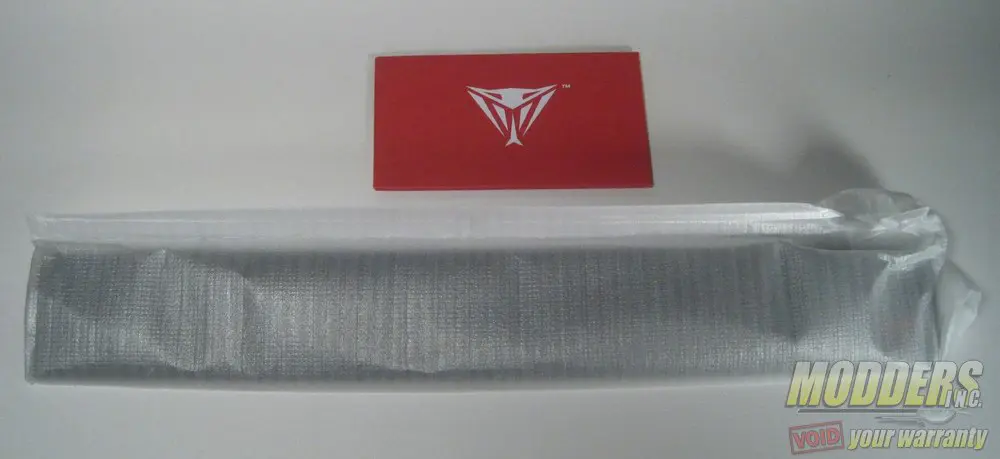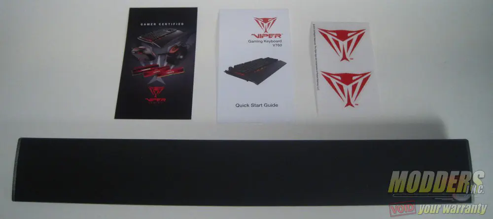 Inside the red box is the keyboard, which is protected by a plastic bag and a grey piece of foam. Along with the keyboard is a red envelope and a palm rest. Inside the envelope is some promotional material, two Viper stickers (red ink on transparent background), and a quick-start guide.