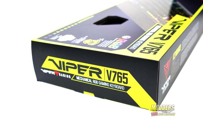 The front of the box has the Viper Gaming logo with their signature Viper Head on the top left-hand corner. There is a picture of the V765 with its RGB lighting illuminated on the center of the box. On the top right, there is the Viper logo and V765 branding. Along the right side is RGB branding as well as the type of switch used. In the case of the V765, we received, its Kailh White box switches. The last thing of note on the front is the cut out over the up key. This allows you to test out the switch and get a feel for how the keyboard feels.