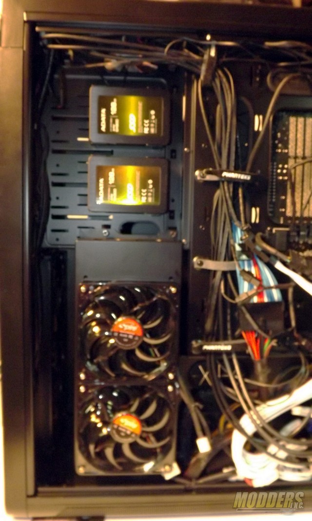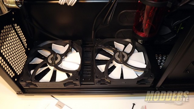 Peeking from inside the case with the HDD Cages removed you see the other side of the radiator mount that’s hidden.