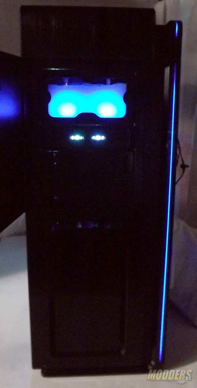 Front view of the case, lights and Monsoon Series 2 Premium 5.25″ Dual Bay Reservoir and case LED strip lighting.