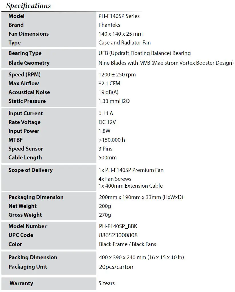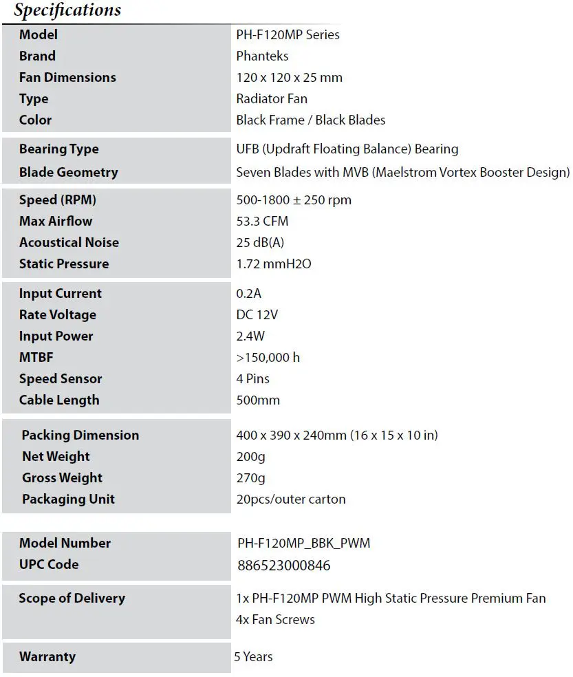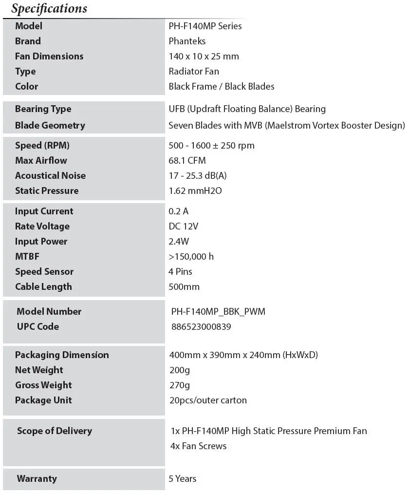 Case and cooling manufacturer Phanteks has made available two new premium fan series to their line up: the MP series and SP series fans. The MP series fans are high static pressure fans utilizing a seven MVB II blade design and updraft floating balance bearing. 120 and 140mm MP series fans are available with black frame and black blade designs. The PH-F120MP fans have an RPM range of 500 to 1800 while the PH-F140MP have a range of 500 to 1600 RPM.