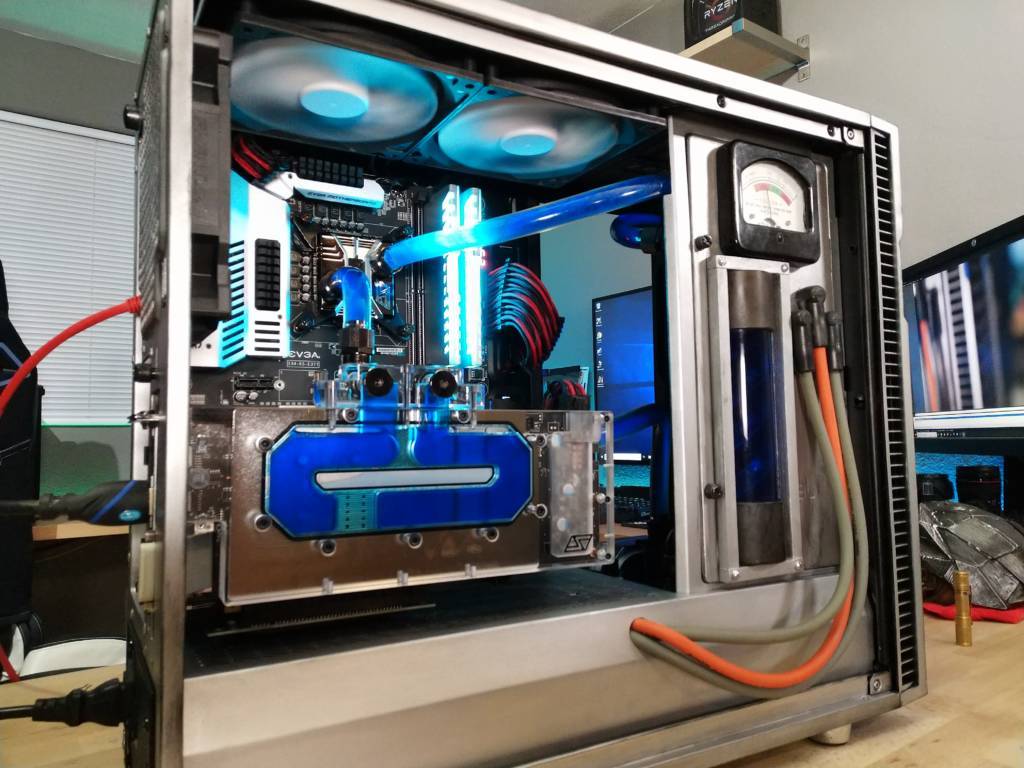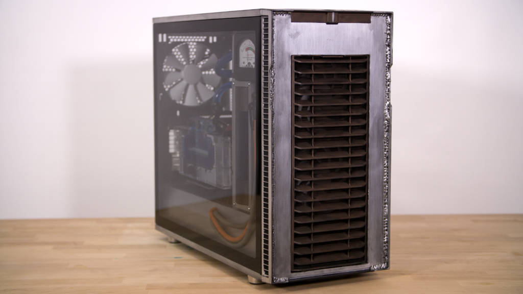 All told, the complete mod required about 40 hours of work beginning to end. Outside of the hardware used, the mod cost only ~$80, including purchasing waaay more Rub ‘n Buff than I really needed (the silver was done with 1/2 of a 1oz tube!). I am over the moon with the results, and would only change a few things if I were to do this build again. None of which would affect the visual results, rather it would just make it easier to work on. Obviously I would like to fabricate a more permanent mounting solution for the reservoir, as well as plum in a better fill and drain system (bleeding this loop is an absolute pain). I also had planned on including two 280mm Swiftech Radiators, but misread the requirements in the Define R6. With the hard drive mount in the forward position, only a 360mm Rad would fit, and even then, my memory heatspreaders are too tall and would interfere. Cooling at stock speeds on the i7-8700k and 1070 Ti are both great, but with only a single Rad, it leaves very little room for overclocking.