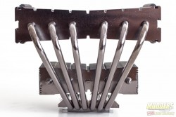 The heatpipe arrangement is an interesting one with six long 6mm heatpipes extending tall and curving toward a wide aluminum fin array. Four of the middle heatpipes that go through the base extend upward again on the other side and curve into a smaller fin array. A strip of rubber is hard fixed at the edges for fan vibration dampening.