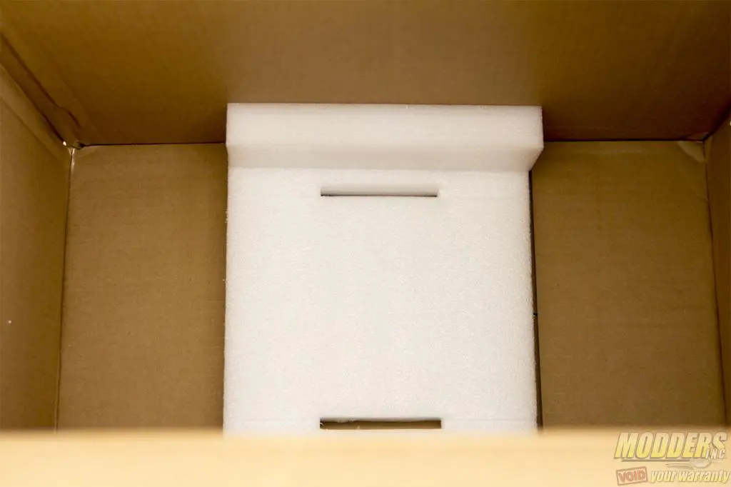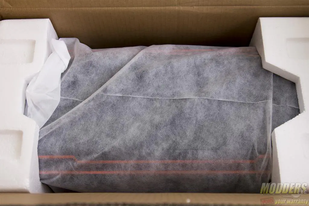 Be quiet! takes a conservative approach to the shipping box with a plain brown cover using black print. Once inside however, there are a few things of note that are atypical of other case packaging: namely the use of fabric cover instead of plastic and supporting foam for the bottom to absorb any extra unwanted impact. The Styrofoam packaging flanking the case on each end is also quite a bit thicker compared to standard mid-tower case packaging.