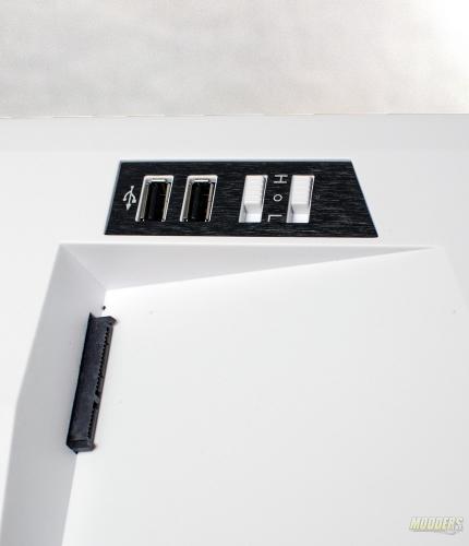 Near the front of the top panel are two fan controller switches, as well as a pair of USB 2.0 ports. Directly under these is an external SATA hard drive connection, for easily connecting and accessing files without having to pull the computer side panel off. A cover here would keep any damage from happening to the SATA connection as I can see this space being used to store stuff when there is no drive occupying the space.