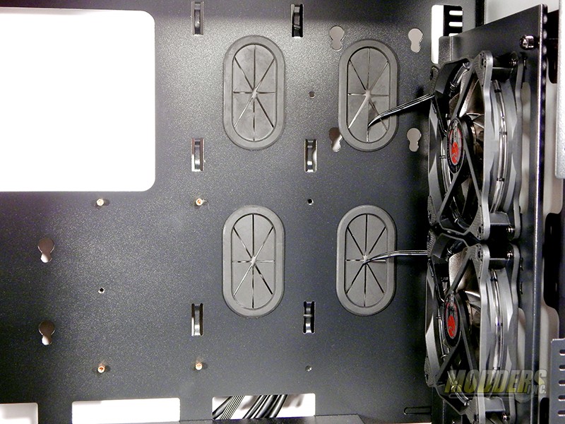 With a closer look inside we can see the 4 cable routing pass-throughs and the two removable front 120mm LED fans. There is room here for a 3rd 120mm fan or 2 140mm fans can be mounted. There are also other cooling options available with internally mounted radiators of up to 360mm for liquid cooling.