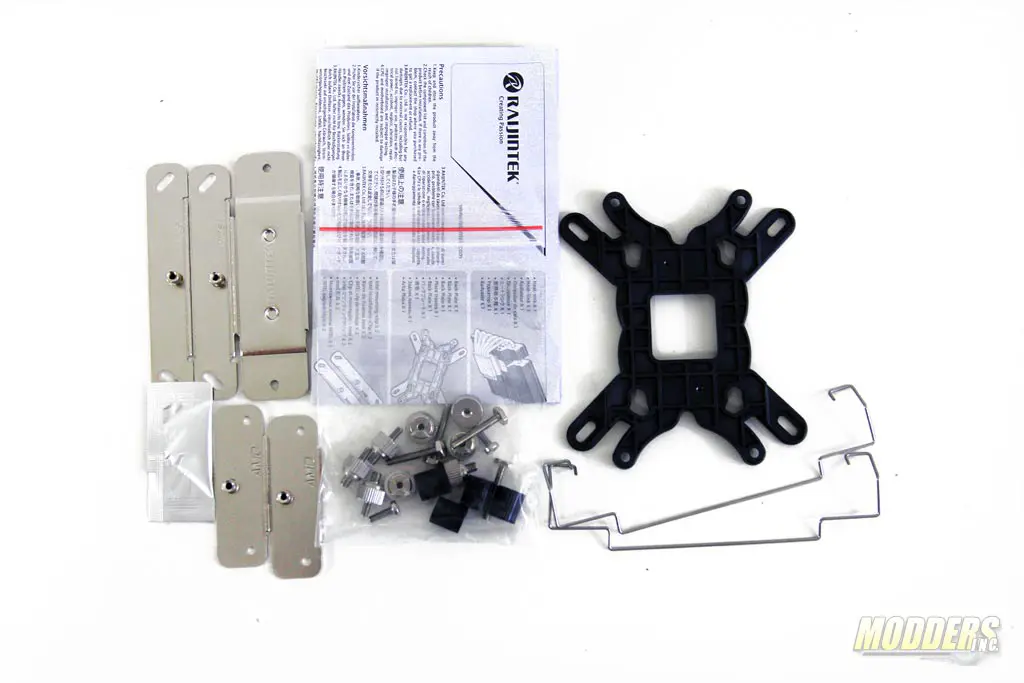 Being a low-profile cooler, the Raijintek Pallas is modestly packed but the external box itself is a glossy full-color print with useful specifications and various photos of the Pallas artfully placed all over. Inside, the bundled slim fan sits on the top compartment with a cardboard acting as a triple partition between the the Pallas heatsink, the fan and the accessories. There is no foam padding the Pallas heatsink but the cardboard partition extends to the sides as well as protective buffer so the fins are not damaged during transport.