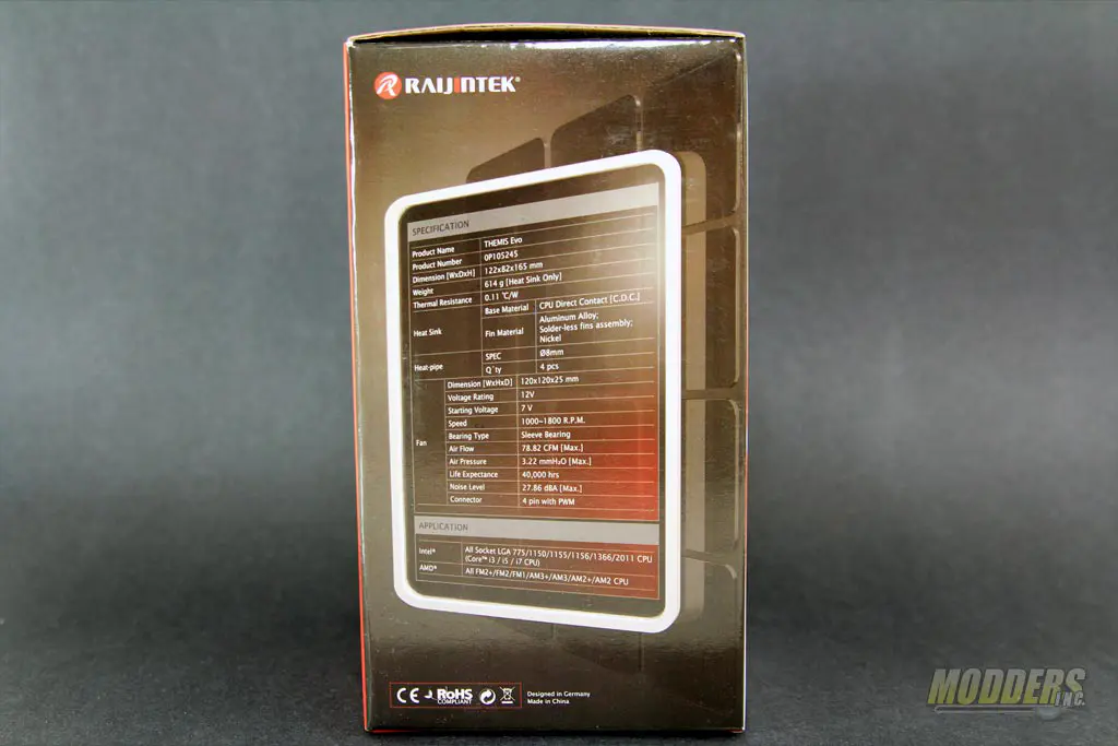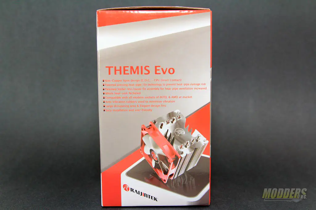 The Raijintek THEMIS Evo box is full-color gloss following their red, white and black color theme observed on their other product brand. A table of specification is printed on the side and the rest of the box shows off the Raijintek THEMIS Evo’s features.
