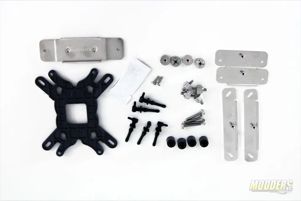 The accessories consist of a universal backplate, 4x knurled threaded screws, 3x LGA2011 standoffs, 2x M3 screws, 5x rubber fan mounts (1 extra), a heatsink crossbar, 4x threaded spacer nuts, 4x thumbscrews , a pair of Intel mounting bars, a pair of AMD mounting bars, thermal compound in a small packet and a multi-lingual fold-out installation guide.