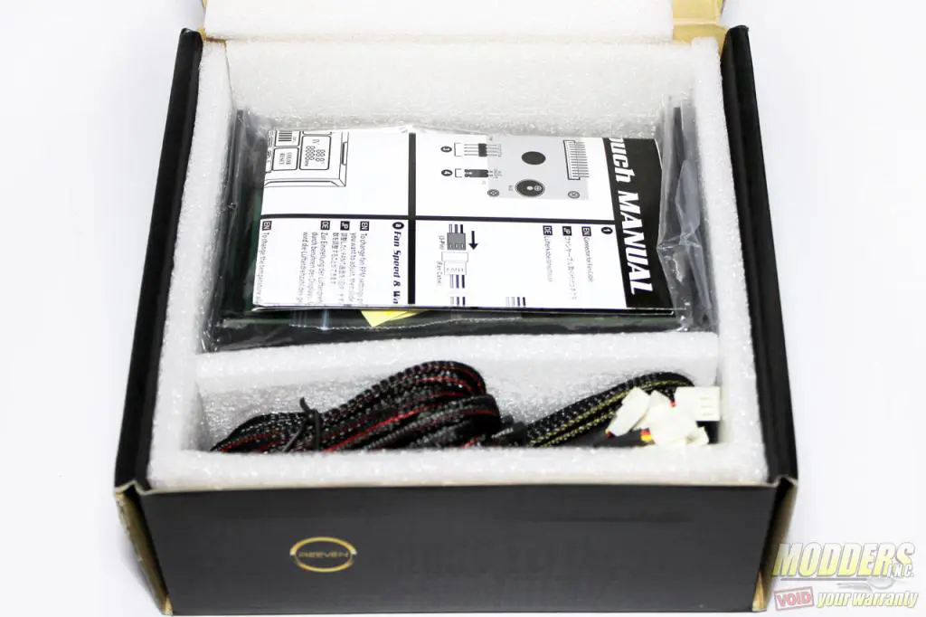 Each Four Eyes Touch package comes padded on all sides including top and bottom with the contents separated in two partitions. Although a fairly small product, the Four Eyes Touch has plenty of functionality so luckily the fold-out users’ guide is easy to follow with complete diagrams demonstrating what does what. Two sets of braided cables are included: one set contains four 72cm 4-pin compatible fan extensions and another set includes four braided cables of the same length for the two-pin thermal sensor headers. Mounting screws and stickers for the thermal probes are also included.