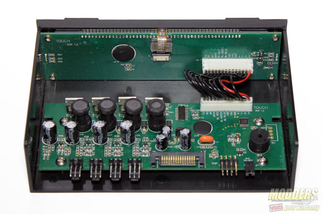Power is fed via a single SATA connector that is positioned with the notch upwards, which actually helps a lot with cable management if the fan controller will sit at the top-most part of the case. Each channel has a Fairchild Semiconductor FQP series 50N06 N-channel TO-220 MOSFET with four chokes and 330v ChengX electrolytic capacitors. The 8-pin header set to the right of the SATA connector is where the thermal probe sensor cables plug in vertically per channel and a jumpered header toggles beeping notifications coming from the built-in speaker right above it. THere are two PCBs mounted on the casing, one for the front display and one for the power, each with a chip on board controller handling the main functions. The bottom of the unit is bare except for the product sticker, although this sample in particular has a printing error with the name (although the product code is correct).