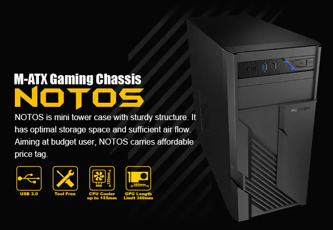 Reeven has introduced a new compact mini-tower case that supports micro-ATX motherboards dubbed the NOTOS, aimed for budget conscious users. Despite the compact size, the NOTOS supports CPU coolers up to 155mm tall and graphic cards up to 360mm long. For convenient installation, the NOTOS also features tool-free drive mounting.