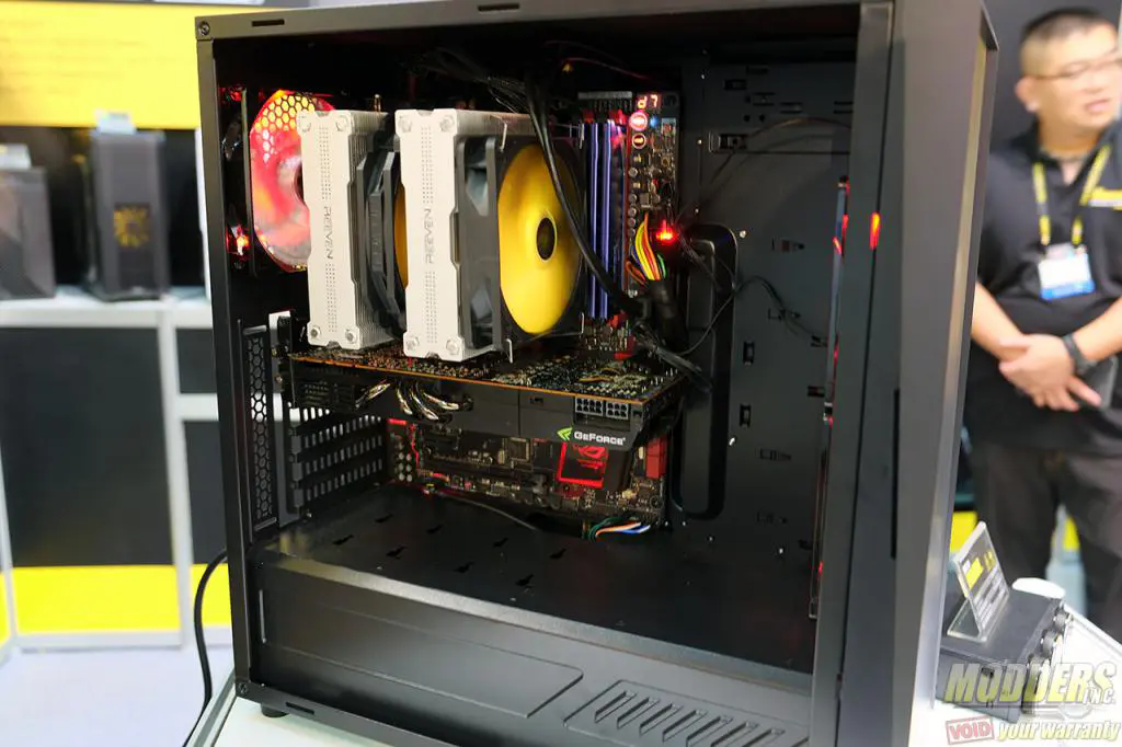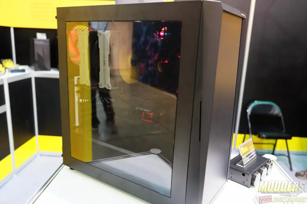 The design is minimal but has a slight angular front bezel that looks quite elegant. Like most silent oriented cases, the front is actually a door lined with noise dampening material. It is also quite compact for a mid-tower case as it does not have the usual bank of HDD cages or 5.25″ cages lining the front, giving longer graphics cards more room and for front radiators to be mounted (up to 240mm rads supported in front). Large CPU air coolers are also supported up to 180mm tall according to Reeven, allowing dual tower coolers such as the Reeven Okeanos which is 163mm tall to fit comfortably like they had on display at Computex.