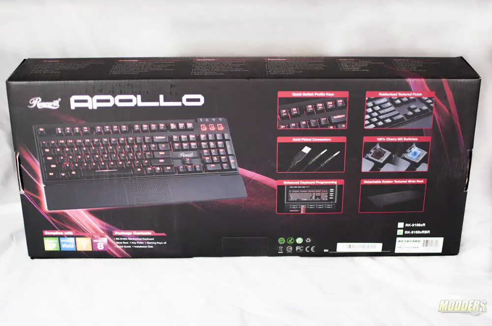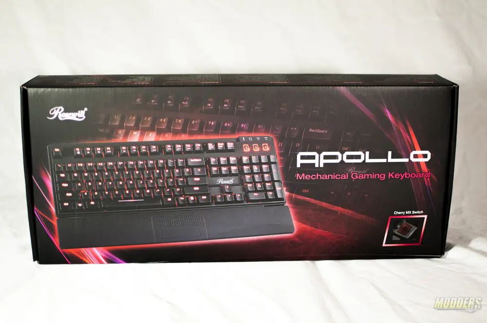 The Apollo box features a large graphic of the keyboard with backlit LEDs turned on. In the lower right corner you’ll see a Cherry MX Brown key switch picture.