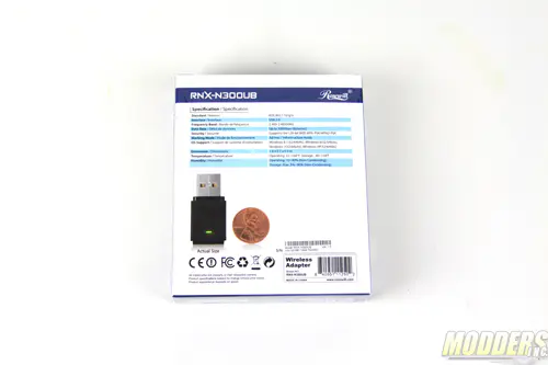 Just like other networking products that are designed by Rosewill, the RNX-N300UB has the same blue/white color scheme of the packaging. The packaging for RNX-N300UB is very small. Just to give you a general idea on the size of the unit is a little bigger than a US quarter dollar. So as you can imagine that the packaging is tiny as well.