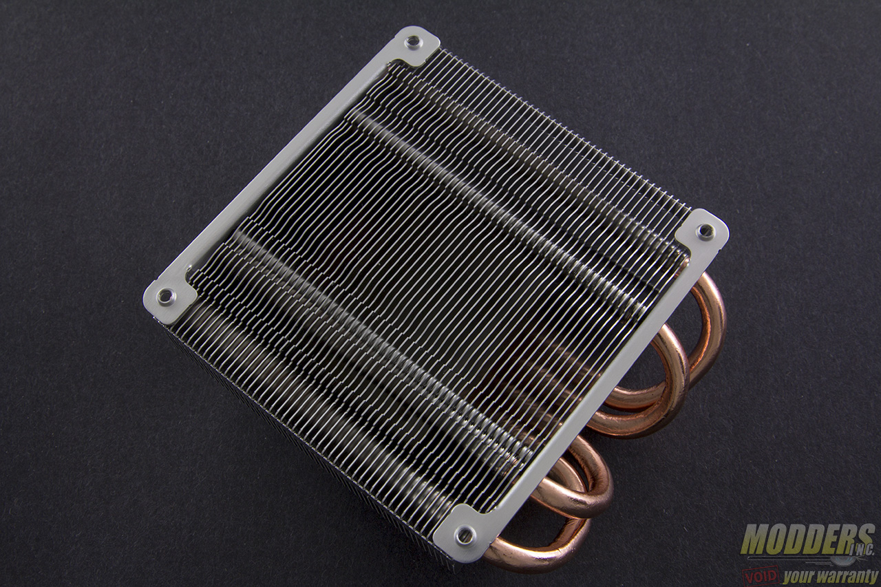 The contact surface has four flattened direct contact copper heatpipes with a 1.15mm gap in between them. Total contact surface area measures 34.5 x36.10mm. The heatpipes are 6mm in diameter and curve to form a “C” shape all on one side, distributing to the 52-fin aluminum array. There is no gap between the solid aluminum primary stage holding the direct contact heatpipes and where the aluminum array begins.