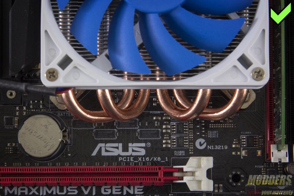 The test motherboard is an ASUS Maximus VI Gene micro-ATX motherboard and measuring from the edge of the socket (the gray plastic part), there is a 31mm gap between the CPU socket and the first DIMM slot as well as a 52mm clearance between the CPU socket and the topmost PCI-E x16 slot where the graphics card is installed:
