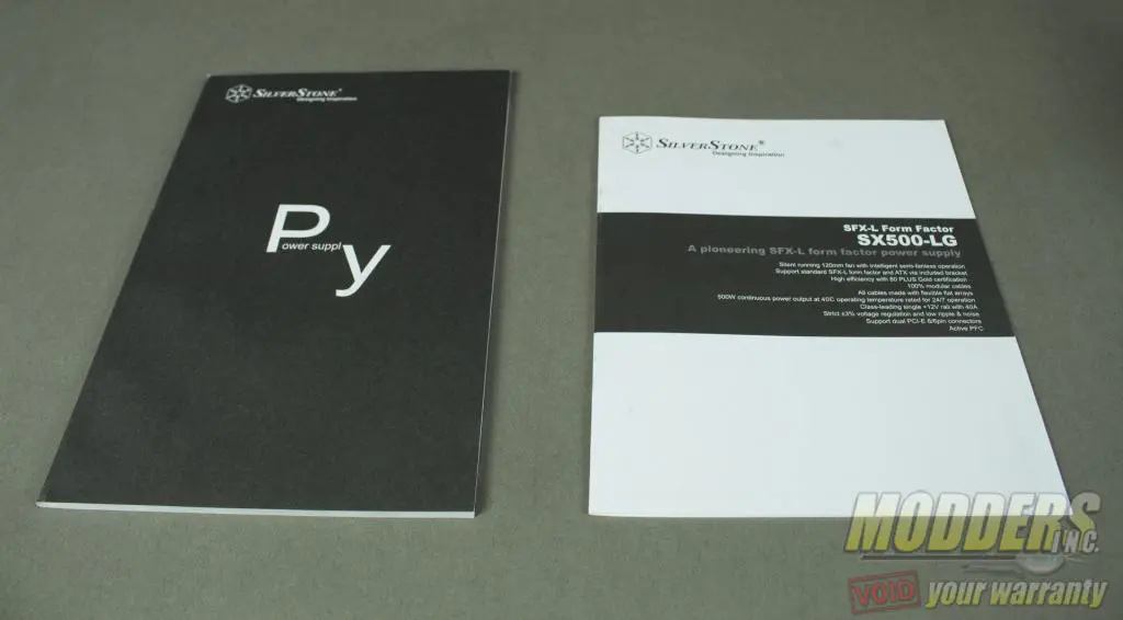 Included in the retail packaging comes a Silverstone product manual, SFX-L 500 watt manual, SFX to ATX adapter plate and four 6-32″ black screws.