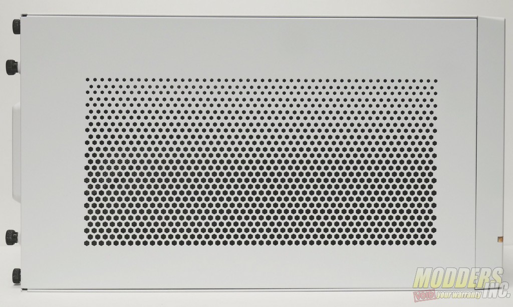 The back panel of the case is a fairly standard affair, with a fan mount for up to a 140mm fan, three expansion slots, and a pass-through cable for the internally mounted GPU. The four removable panels of the case are attached to the back panel with large captured thumb screws. Of those four panels, the bottom panel is the only one lacking any form of ventilation.