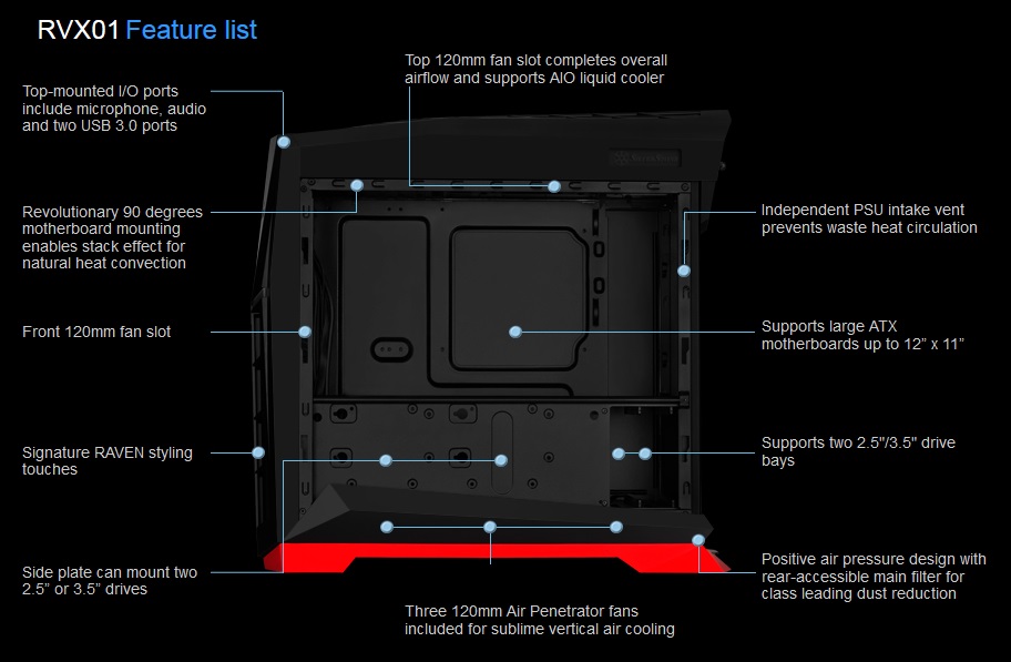 After completing the evolutionary RAVEN RV05 with 5.25” drive bay design completely removed, the RAVEN team created another forward thinking line of cases with the introduction of the “RAVEN X” subcategory. This line will not only retain the essence of what made the original RAVEN series great with features such as signature aggressive styling and 90 degree rotated layout, but also cater to enthusiasts looking for more exciting designs in an entry-level price point. With the smallest ever footprint for a ATX RAVEN tower case, the RVX01 has remarkably accommodating interior that can easily fit large ATX motherboards up to 12” x 11”, full size graphics card, four 2.5”/3.5” drives, and spaces for up to three radiators. From the factory, the case will come fully equipped with three of SilverStone’s famed Air Penetrator fans for class-leading thermal performance and easy to reach filter for easy maintenance. If you are looking to build an attractive, relatively compact and powerful PC on a budget, the RVX01’s combination of high affordability, top-level cooling ability, and flexible layout will fulfill the task beautifully.