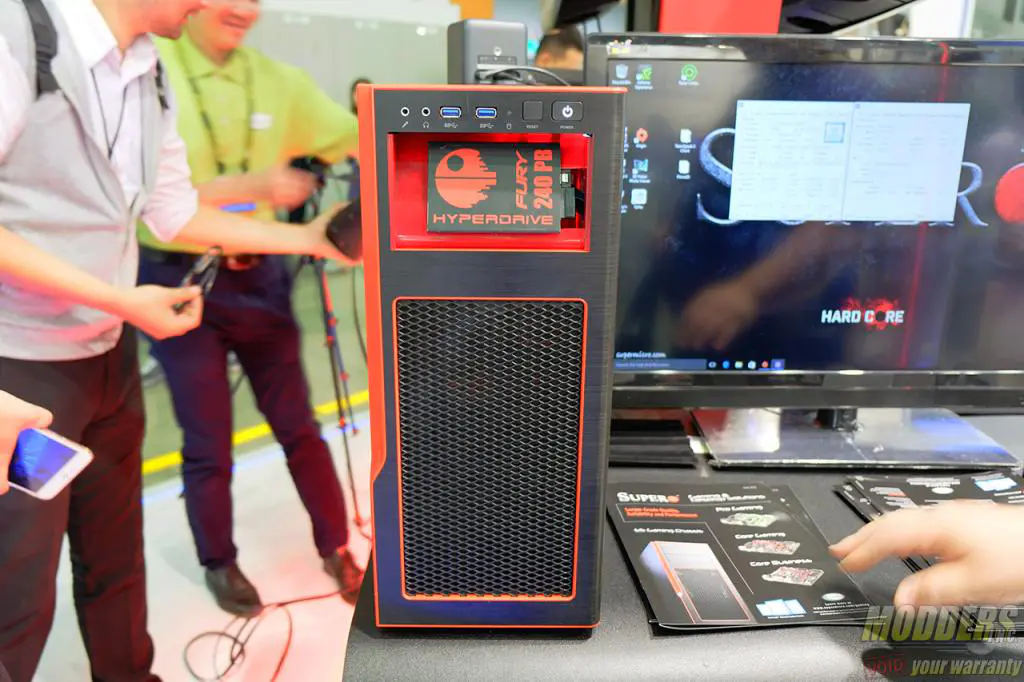 The Supermicro S5 chassis on display at Computex was a Star Wars themed modded case and was the only non-server case on show at their booth. This is not Supermicro’s first attempt at a mid-tower gaming case, offering a gaming version of their SC732G case previously but that was basically just a retrofitted version of their SC732 server midtower case with LEDs and different exterior. The Supermicro S5’s build quality was surprisingly impressive with a brushed aluminum front cover with red trim, reminiscent of AMD’s 6000 series graphics cards. Much of the interior on the Star Wars casemod on display was modded from the original however, housing a 360mm radiator on the top with custom hardline tubing and custom PSU shroud. The 5.25″ external drive bays have also been modded to mount an SSD and the right side panel has custom Star Wars graphics.