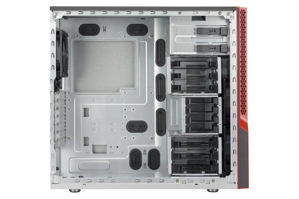 The regular Supermicro S5 however is a lot more utilitarian, with the front bezel looking exactly like the modded case but the interiors are not powder coated black (only the exterior). The interior layout is very good however, with a bottom mounted power supply mounting, support for 280mm radiator, support for up to six 3.5″ drives and four 2.5″ drives (positioned in the middle to allow for graphics card clearance) and plenty of grometted routing holes for cable management. The Supermicro S5 is currently available on Amazon for $109.99 USD