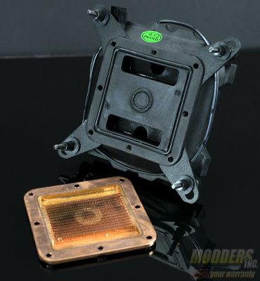 The Apogee water block can be customized as well. After removing the pins that hold the front cover on, the user can replace the colored insert with one of the four provided or create their own. In the center of the water block is the LED lighting and is powered off of either a motherboard header or the included PWM hub.