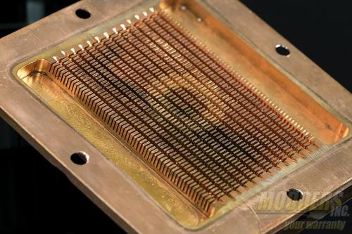 The base of the water block is machined from C110 copper and features a fin/pin array. 225 fins/pins increase the surface area the water comes in contact with as it flows through the block and absorb heat. I noticed a little bit of discoloration on the block however, I didn’t see any deposits or flux stuck in the fins.