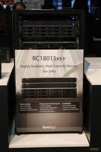 While on the main floor with Synology we saw their great line up of NAS/DAS (Network Attached Storage/Direct Attached Storage)enclosures for pretty much every kind of demand. One of the newest enterprise storage enclosures that Synology is offering is RC18015xs+. This multi bay NAS device has all of the latest bells and whistles when it comes to High availability and 10GbE capability. More and more we see 10GbE devices on the market and Synology is no stranger.