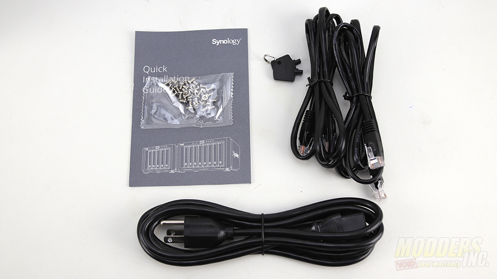 To get you up and running fast, the Synology DiskStation DS1821+ comes with two Cat 5 network cables, a bag of screws, two security keys to lock the drives in place, a power cord, and a Quick Installation Guide.