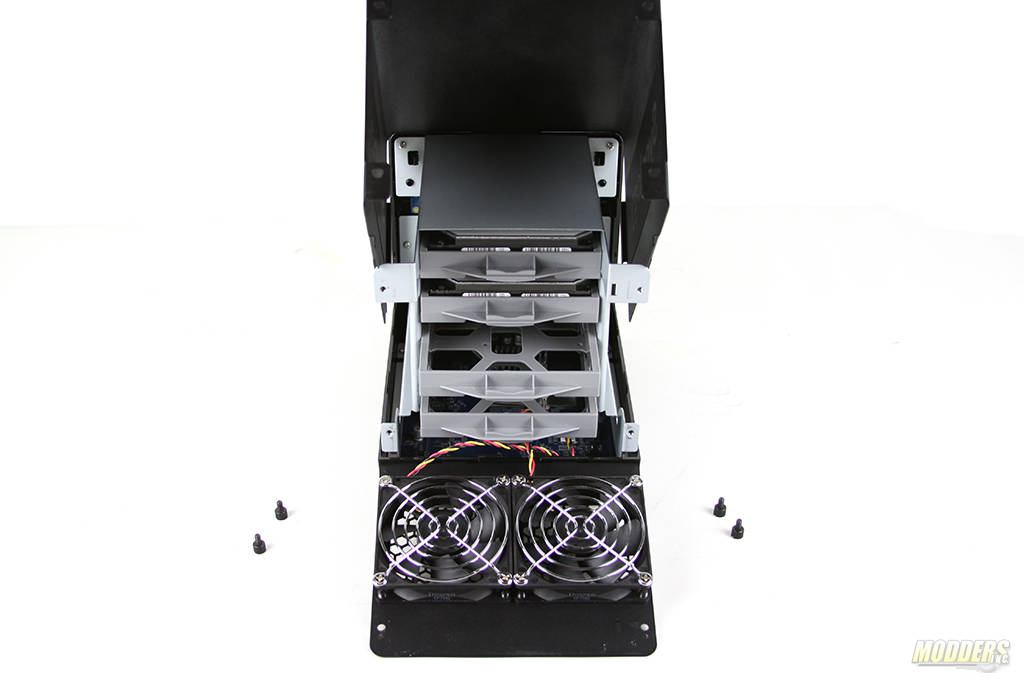 In order to install drives in to DS418j you need to remove four screws from the back of the device and remove the cover. The drive sleds are conveniently placed for the users to remove them as need to. The whole enclosure is actively cooled by two 80 mm fans. These fans are not PWM enabled however, it is possible to adjust their RPM from within the OS. (Full-Speed Mode, Cool Mode, Quiet Mode, Low-power Mode)
