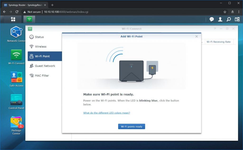 To get started you need to make sure that your RT2600ac is running SRM 1.2-7742 firmware with minimum Update 1. Without this firmware, you will not be able to deploy MR2200ac access points. When you update to the correct firmware only then you can see Wi-Fi Connect option your SRM.