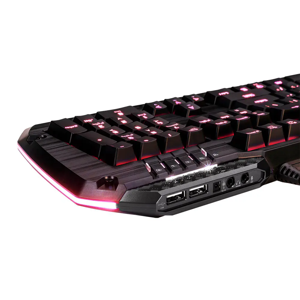 The Lobera Spectrum comes with a pass-through hub with audio/mic jacks and 2x USB 2.0 ports with a DC-in jack allowing gamers to charge their smart phones and tablets directly through the keyboard.