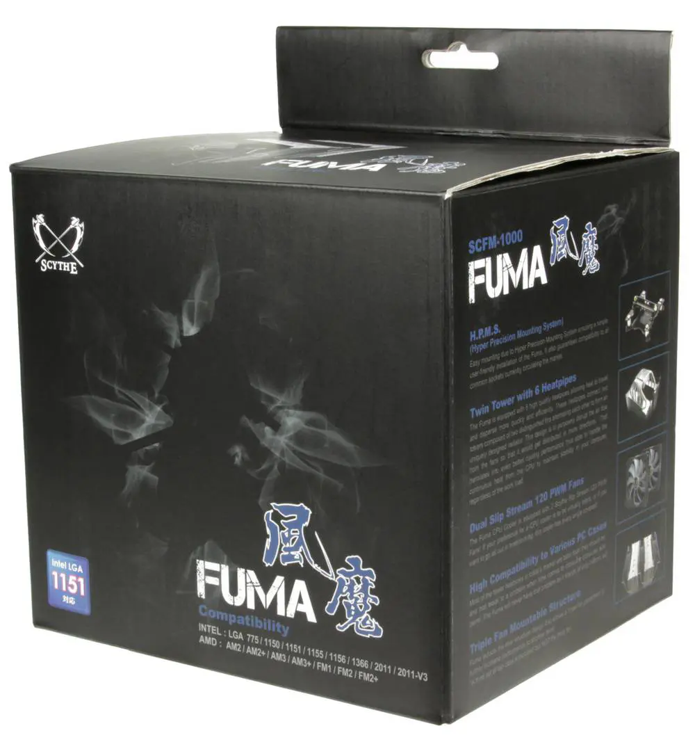 The Scythe FUMA supports up to three 120mm fans and is in fact bundled with a pair of Scythe Slipstream PWM 120 fans with an RPM range of 300 up to 1,400 depending on the load. Even with both fans installed, the Scythe FUMA only weighs 920 grams and secured with a widely compatible high-precision mounting mechanism that is compatible with AM2, AM2+, AM3, AM3+, FM1, FM2 and FM2+ from AMD™ as well as sockets LGA775, LGA1150, LGA1151, LGA1155, LGA1156, LGA1366, LGA2011 and 2011(-v3) motherboards from Intel.